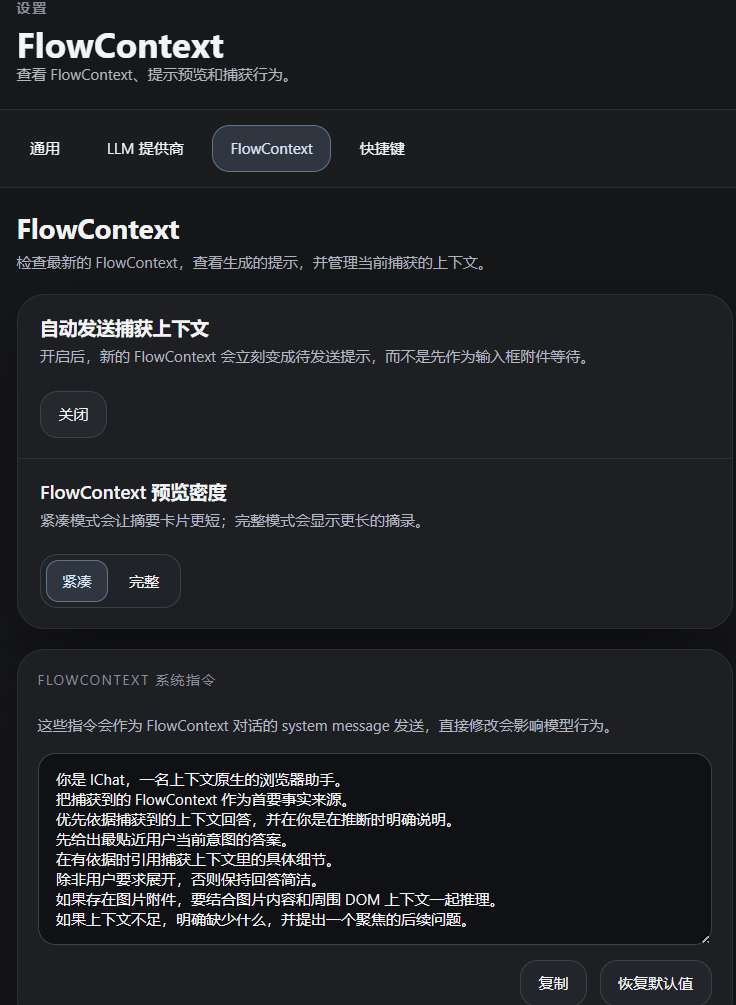 - FlowContext 系统提示词:作为system prompt,可自定义