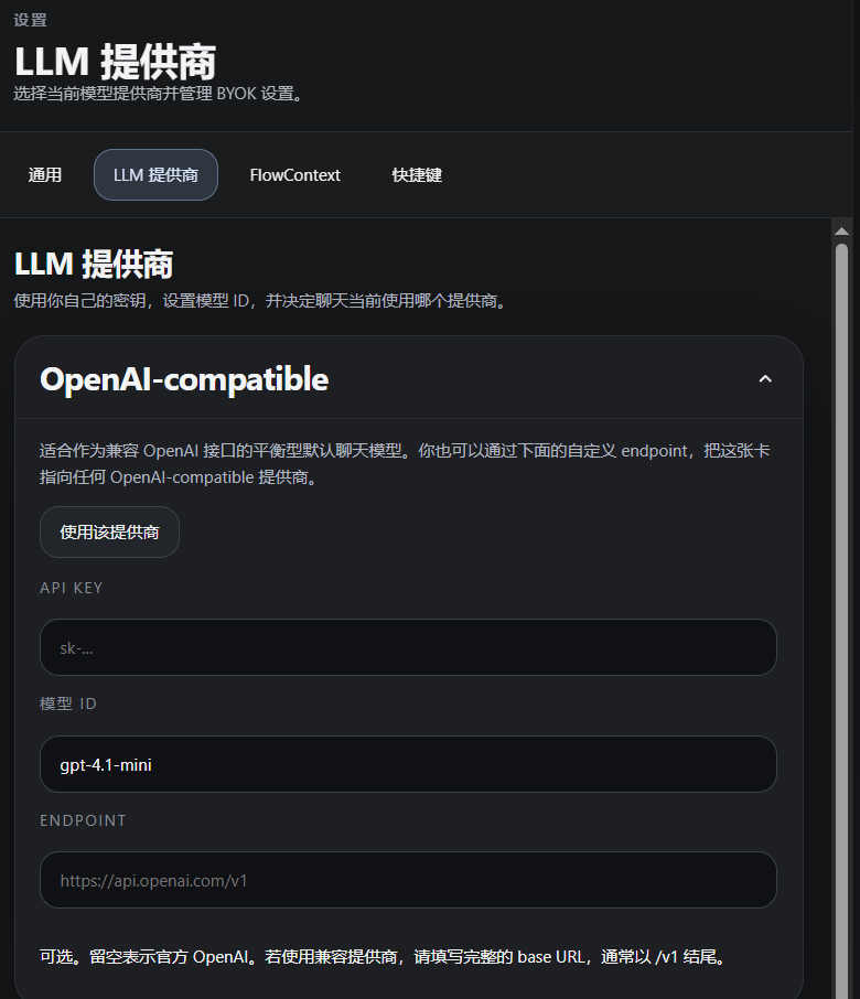 - 支持 OpenAI-compatible、Gemini 和 Anthropic 的 BYOK 配置